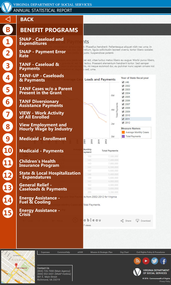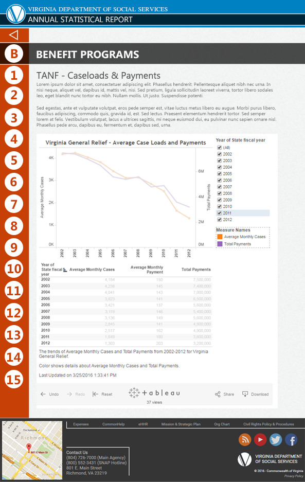 Recently, the agency purchased a subscription to Tableau, a interactive business analysis and reporting tool. The system is designed to be embedded into any website of the consumer's choice. In this case, the agency requested a custom template for the software. It was requested that the design mimic the current VDSS website, but also have a presence distinct to it's own.