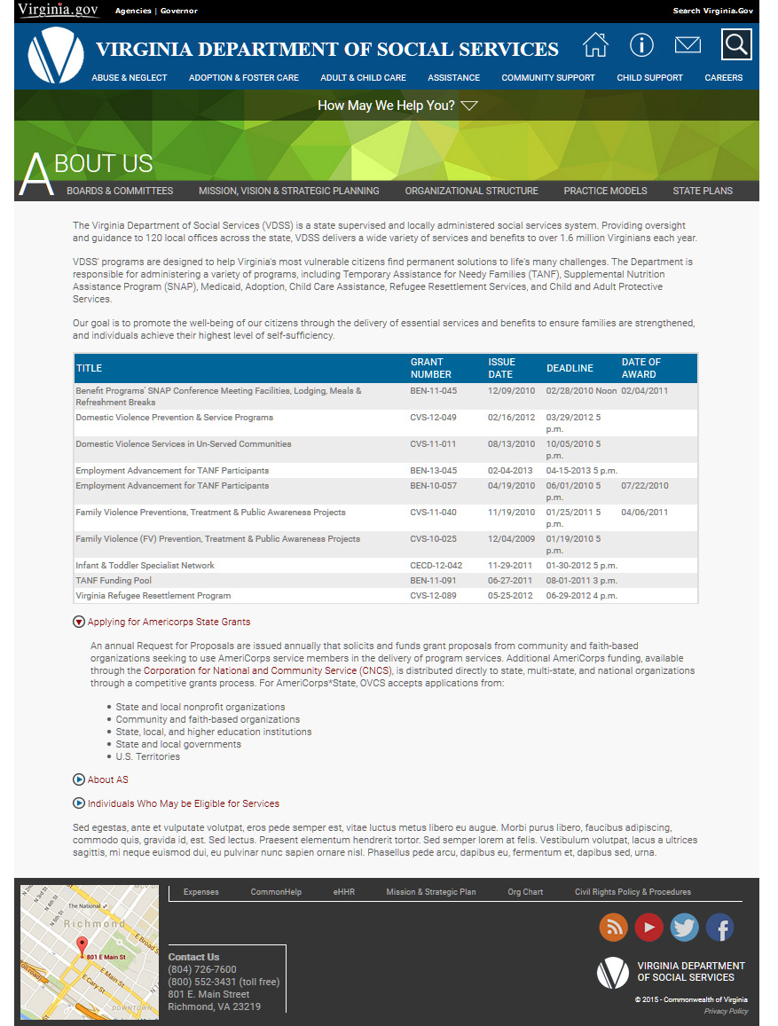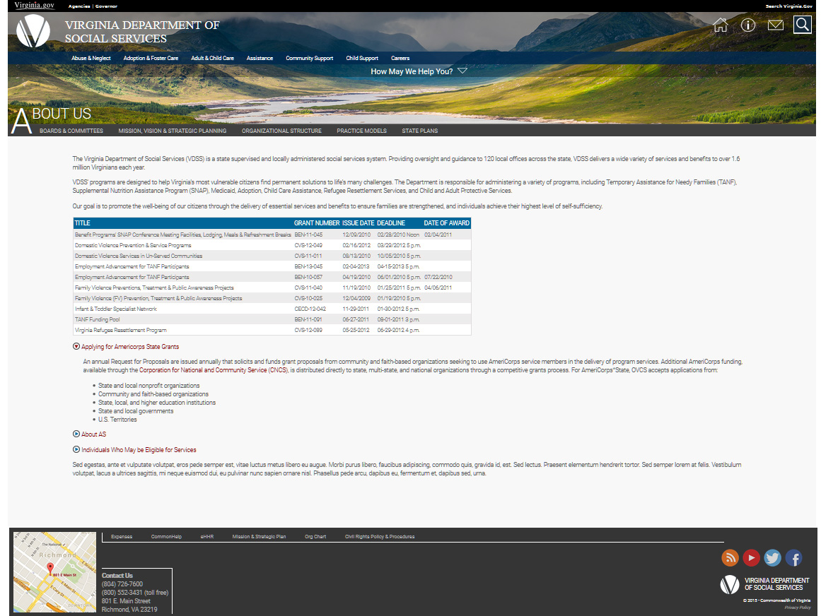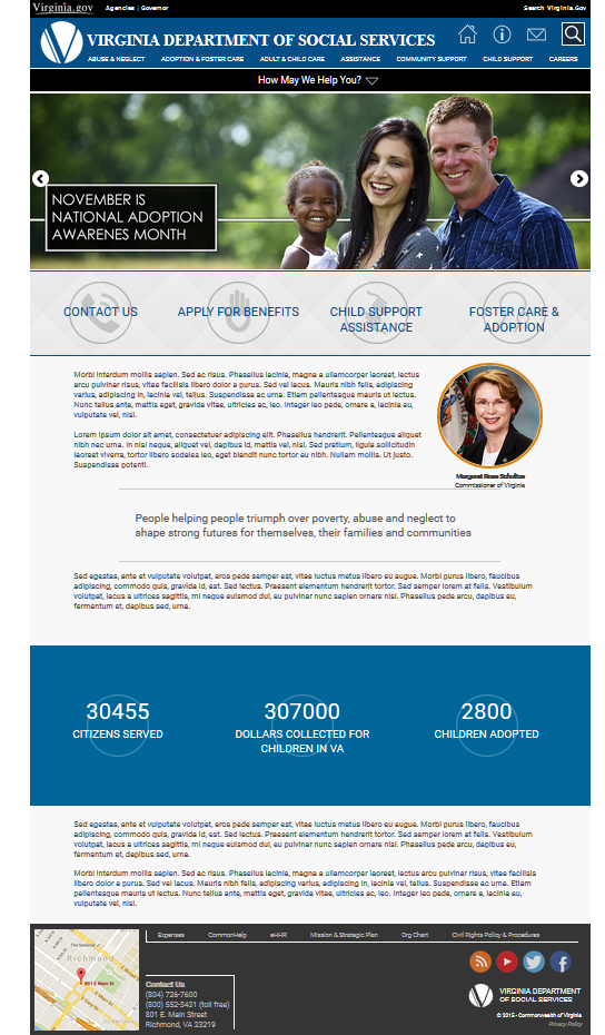 The Virginia Department of Social Services mission statement is "People helping people triumph over poverty, neglect and abuse." A powerful statement which deserves a powerful presence on the web. As I mention on the intranet page, when I joined the organization their web developer had abandoned them, leaving a major hole in the public affair's division. I was initial brought on to assist him in design and development efforts; however, due to his departure I was now lead. I felt the same pressure with this site as the intranet site as I put forth my best efforts to address the backlog of updates requested by the agency.
